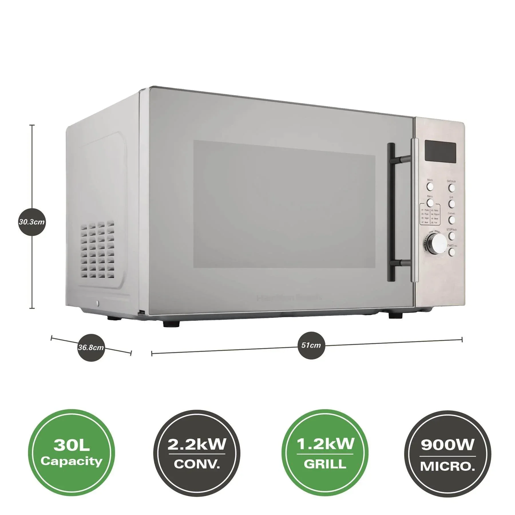 - Grill Rack: Complete with a grill rack, the Hamilton Beach 30L Combination Microwave with Grill is the perfect all-in-one solution for hassle-free family cooking. Elevate your kitchen experience with this versatile appliance – where capacity meets convenience for culinary excellence.